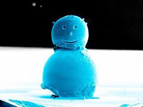 С помощью лазерного луча у снеговика сделаны глаза и рот. Его фотографию публикует сегодня лондонская газета «Таймс». Диаметр микроскопического объекта – чуть более 10 мкм (0,01 мм), или пятая часть толщины человеческого волоса. Согласно объяснению NPL, "снеговик" был изготовлен из двух микроскопических шариков, обычно используемых для калибровки астигматизма электронного микроскопа. Части соединены специальным платиновым сплавом. Глаза и улыбка получились благодаря применению фокусированного ионного луча, а нос диаметром 0,001 мм – это осаждённая лучом платина. Масштаб отлично демонстрирует видео.